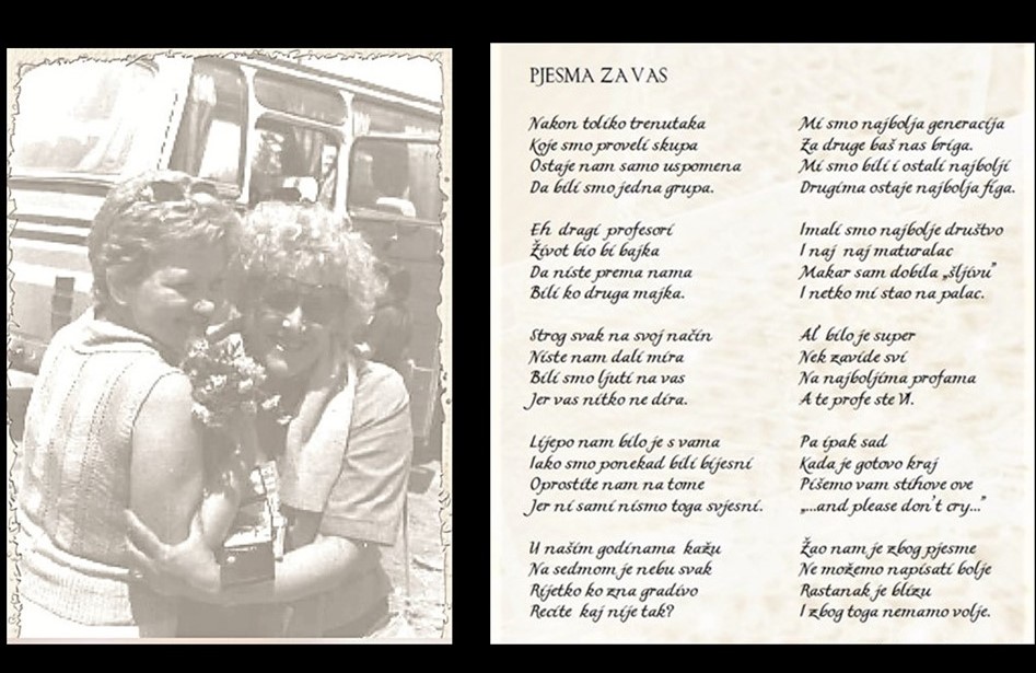 Njezin joj je razred (generacija osmaša ’93./’94.) napisao lijepu oproštajnu pjesmu koju prenosimo iz naše tiskane spomenice.